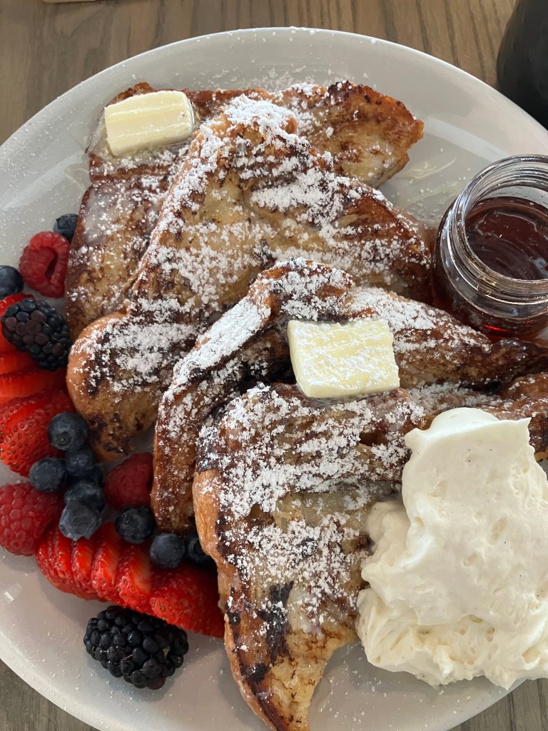 French toast with added mixed berries and cream