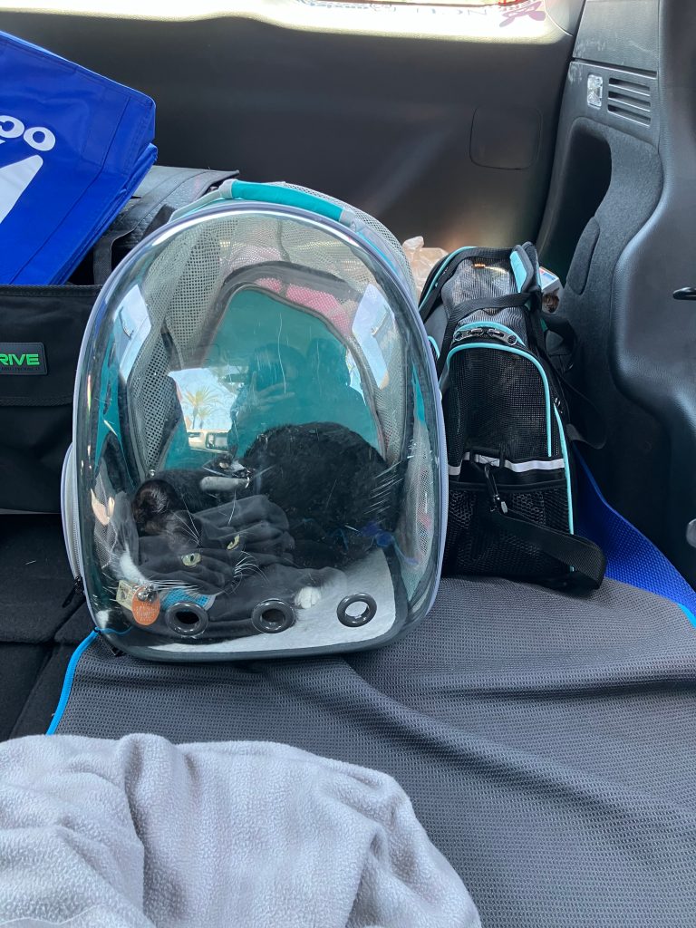 Oreo (left) and Biscotti is in the carrier on the right.